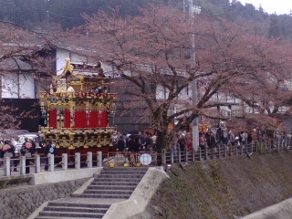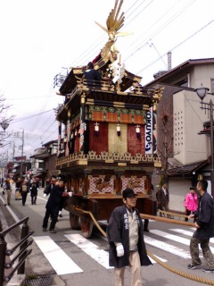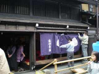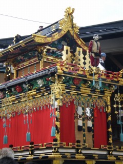 高山祭り初日。9時半からの屋台曳き揃えの時間に合わせ、宿を出ます。夜から朝方まで降っていた雨はあがりましたが、時折ポツリポツリと雨が落ちてきます。陣屋前の案内所で祭りの開始時間の確認したところ、雨があがり次第、屋台が出されるとのこと。各屋台蔵を周ってみることにしました。