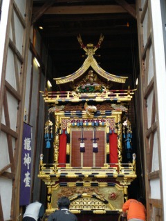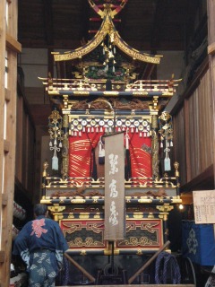 龍神台(りゅうじんたい)の屋台蔵でもお祭りの準備中。わずかな時間だけでしたが扉が開き、屋台を見ることができました。