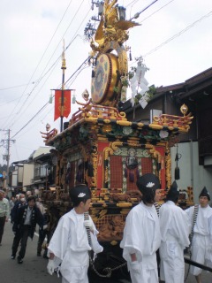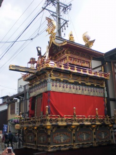 屋台行列を先導する神楽台(かぐらたい)。からくり奉納がある時にはお旅所前に曳き揃えられます。