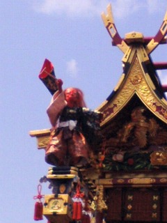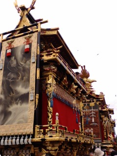 約50分ほどのからくり奉納を見た後、曳き揃え場所へと行ってみました。道にずらりと並ぶと、とても綺麗。。かなり間近で見ることができます。どの屋台も赤と金色が多く使われ色鮮やか。。そして、彫刻や刺繍など細部までとても凝っています。。