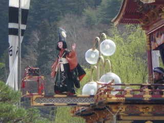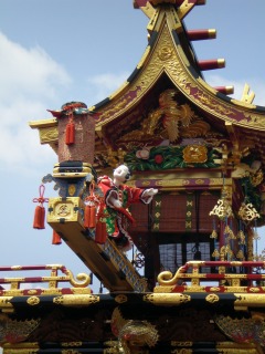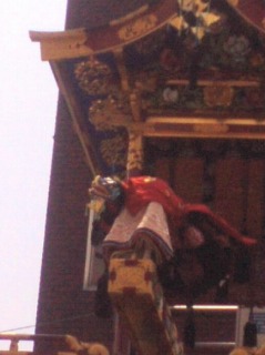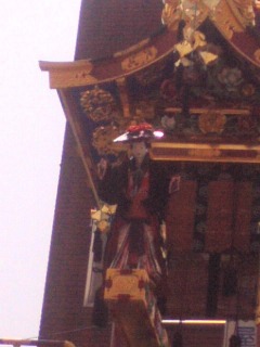 石橋台(しゃっきょうだい)。美女から獅子に変化するからくりを行う屋台。蔵の前にて待機中です。