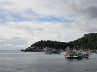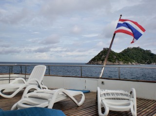 今日はとうとう下船日です。ダイビング休憩中によくお昼寝していたサンデッキの向こうにはタオ島が見えてきました。タオ島からは大型ボートでまたサムイへ戻ります。