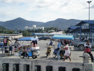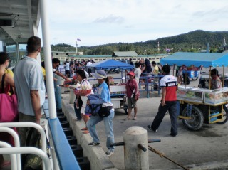 サムイ島からタオ島までは、観光客に交じり大型ボートでの移動です。途中のハンガン島では何人かが乗下船。ここでの停船中には、デッキからはサンドイッチやアイスクリームを買うことができます。