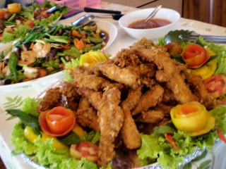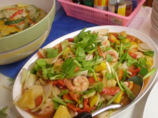 クルーズ船の食事(1日3食&おやつ付き)はブュッフェスタイルで、スープまたはカレーが1品のほか、大皿料理が3品並びます。