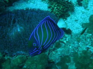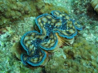 鮮やかなブルーと黄色が目立つワヌケヤッコ。キレイな色のヒメジャコガイも見つけました。