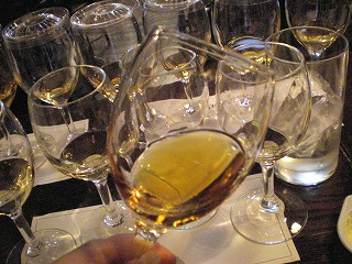 各テーブルには、グレンリベットの12年、15年、ナデューラ、18年の4種類のグラスが並び、12年から順番に試飲。ストレートではアルコールが強すぎて苦手なので、同量の水を足しての試飲です。