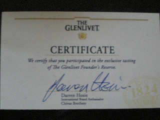 そして、最後は、ザ・グレンリベット蒸留所拡張を記念して造られたという「ザ・グレンリベット ファウンダーズリザーブ」を試飲。こちらはクレンリベットが設立された1824年にちなんで1824本の限定生産だそうです。帰りには試飲したという証明書もいただきました。