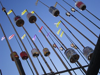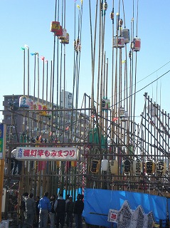 お腹もいっぱいになったところで、観光案内所でもらった地図を手に友だちとのんびり街中散策。夜の提灯竿もみまつりの会場には矢来が組まれ、すでに20m近い長い提灯竿が並んでいました。
