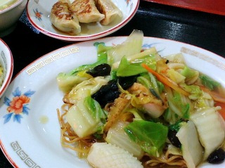 は、上海飯店。炒飯、餃子、スープがセットになった海鮮焼きそばのランチセット。焼きそばには、大きなホタテと海老が入っていました。