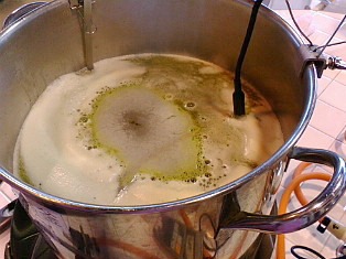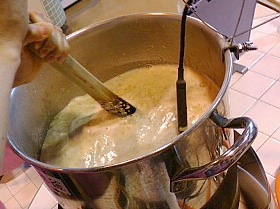 ろ過した麦汁にホップを加え、煮沸。ここでも時間と温度管理が重要です。その後、発酵タンクに移し、ようやく仕込み作業終了。。1日がかりの作業でした。