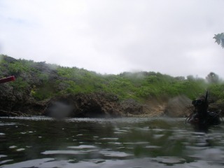 穴を浮上すると、淡水の池へと繋がっています。潜っていると、海水と淡水が混じるあたりから急に透明度が悪くなり、緑色に見えます。
