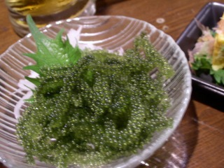 夕食は「藍の龍」 。メニューを見ると、あれもこれもと食べたたくなり、海ぶどう、島野菜の天ぷら、一貫90円寿司の3品を注文。やっぱりこのお店も一皿の量が多い。。天ぷらの野菜(ゴーヤ、紅芋、島らっきょう、かき揚げの4種)は大きいし、お寿司は5貫注文したら、かっぱ巻きまで付いていて、かなりお腹いっぱい。今日も食べすぎ