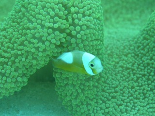 クマノミが全種類(ハマクマノミ、カクレクマノミ、ハナビラクマノミ、トウアカクマノミ、セジロクマノミ)がいるポイントとのこと。中でも、トウアカクマノミは小さく、頭がまだ白くてかわいいです。