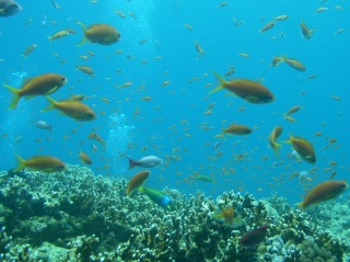 です。ここは、ポイント名の通りハナダイがたくさん群れています。キンギョハナダイに混じり、ベニハナダイ、ケラマハナダイなどを見ることができました。でも、これだけたくさんいると、私にはなかなか識別が難しい・・・です。。