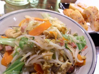 夕食は「紅獅子」。今日もまた宿泊したミヤコセントラルホテルのすぐ近くにある居酒屋さんです。今日はさすがに昨日までの料理の量の多さを学習し、2品を注文。フーチャンプルとチキアギ(手作りカマボコ)だけ。それでもお腹いっぱいです。。