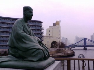 深川江戸資料館の近くにある江東区芭蕉記念館へも寄ってみました。おくの細道などの旅順、書や短冊などが展示されていましたが、あまり興味のわくものがありません。入って間もなくで記念館の庭から隅田川沿いを歩き、分館史跡展望庭園へ移動。でも、庭園と言っても芭蕉像があるだけで殺風景でした・・・