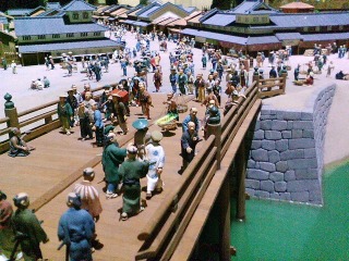 そして、最後に、東京都江戸東京博物館へ。常設展示室の入口を通ると、目の前には日本橋。今の日本橋とは違いとても大きく見えるその橋を渡り、江戸ゾーンへと向かいます。当時の町並み