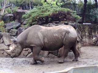 は結構好きです。親子でくつろぐ姿が見えたり、サル同士の上下関係が見えたり・・・見ていて飽きません。。東園から西園へと移動。モノレールでの移動(大人150円、小人80円)もできますが、坂道を歩いて進みます。こども動物園を通過し、アフリカ動物のエリアへ。同じ場所をグルグル周って、落ち着きのないサイ。
