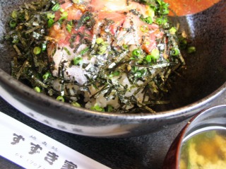 。駅の近くの観光案内所でパンフレットや情報を仕入れ、駅のそばのすずき家で、おらが丼(地魚づけ丼)をいただきました。味は、特に可もなく不可もなくといった感じでした。