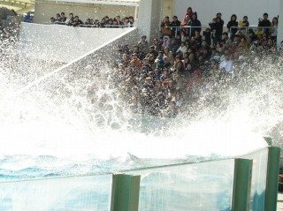 シャチのジャンプ後は大量の水しぶき・・・ステージに向かって右側の座席は思いっきり水が飛んでました。。