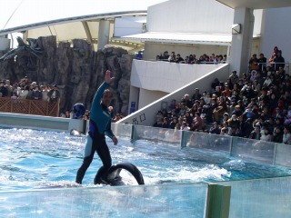 ショーの時間帯をチェックすると、タイミングよくショー開催の時間。まずはシャチのショーへと向かいます。初めて見る