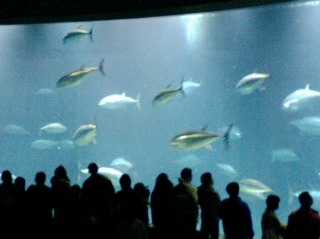 続いて、「ここに来たらやっぱりマグロでしょ・・・」と大水槽へと向かいます。魚屋さんで横になっているマグロは見たことがあっても、悠々と泳ぐクロマグロは初めて。予想以上の迫力で、しばらくイスに座ってボーっと眺めてしまいました。見始めるとつい時間がたつのを忘れてしまいます・・・