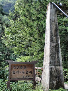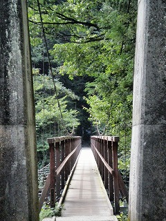 緑の木々に囲まれた道を進んだところにある吊り橋。そして、吊り橋から眺める川が日本の名水100選にも選ばれたという尾白川です。