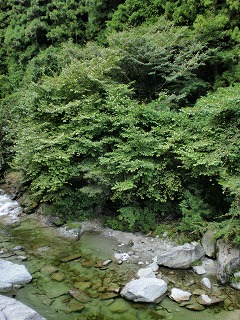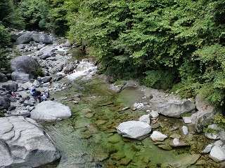 川は橋の高さから見ても川底の石が一つひとつはっきりわかる透明度の良さ。川岸にいた子供たちはサントリーで開催している水育「森と水の学校」に参加者とのこと。自然を体感しながら学べるって素敵なことだと思います。