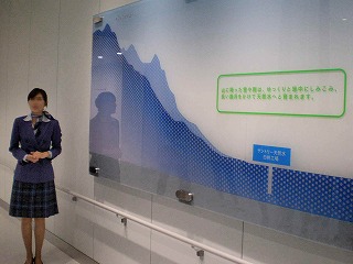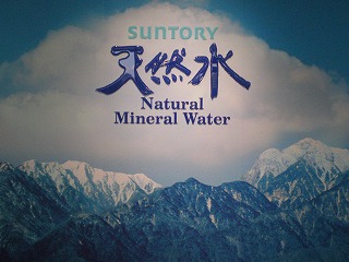 続いては、サントリー天然水 白州工場の見学へ。2010年4月にできたばかりという工場は真っ白な綺麗な建物。入口を入ると、ペットボトルでも馴染みのある天然水の大きな文字が目をひきます。