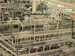 案内スタッフから工場周辺の環境や工場内の工程などについて説明を受けながら見学していきます。こちらの工場では、ペットボトル作りから、ボトリング、包装、出荷までのすべてを行なっているそうです。この日はラインが稼働していなかったのが残念。。
