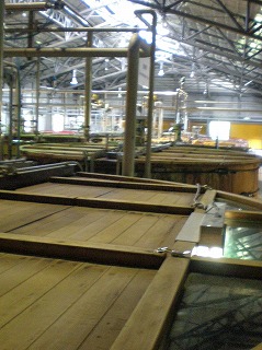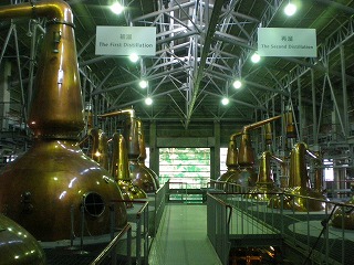 ウィスキーの蒸留ではサイズの異なる銅製の蒸溜釜(ポットスチル)がいくつも並んでいます。手前の釜では火入れが行われており、釜にある窓から火がチラチラ見えました。まさに今作られている・・そんな感じです。