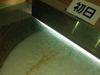 大きな木桶槽の中では麦汁が発酵中。発酵槽の中を覗くと、下からブクブクと泡が上がってくる様子が見えました。