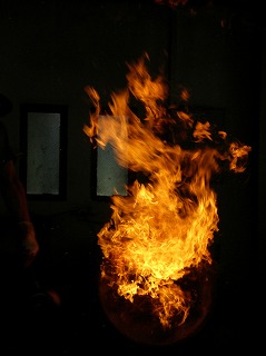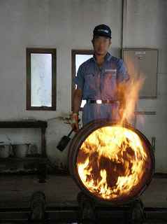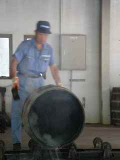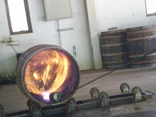 リチャーの見学。。古樽の中に火を入れると樽内は青白い炎に包まれます。その後、さらに火を加えていくと、徐々に赤い炎に変化。初めて見る作業に興味津々です。。