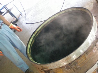 火が大きくなるとともに、樽の内面からは燃えているようなバチバチという大きな音が。。そして火が大きくなったタイミングで水をかけてリチャー終了です。柄杓に一杯だけの水で一瞬にして火が消えました。