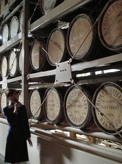 続いて貯蔵庫の見学。建物内には上下左右にびっしりと樽が並んでいます。樽にはそれぞれ作られた年代が印字されており、一番古いのは1973年とのこと。白州工場ができた年に作られたウィスキーです。