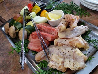 会場は清里にある「牧場通りの小さな旅籠 オーベルジュ」の自然派レストラン レ・ブラ・ドゥ・ラ・テール 美味小舎。レストランに入ると、清里産のニジマスの塩焼きが良い感じに焼きあがっていました。甲州地鶏などのお肉や自家農園の野菜、どれも美味しそうです。