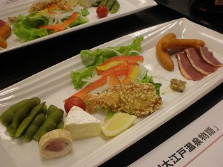 露天風呂、寝湯など一通りのお風呂を楽しんだ後は、早速イベント会場へ。冷たい湯上リッキーが用意されていました。お風呂あがりのリッキーは、さっぱりしていて美味しい~♪ 空きっ腹にもかかわらず、ぐびぐびっと…オードブルを摘まみながら、あっという間にグラスは空になってしまいました。。
