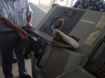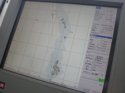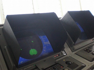まず最初の見学は、操舵室。船の舵やレーダーなどが並んです。双眼鏡を除くと遠くの方に島影が見えます。ずっと海だけの風景だったので、ボンヤリとした形しか見えなくても何だか嬉しくなってきます。
