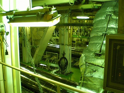 続いて、船のエンジンルームへ移動。こちらは船の底の方にあり、窓もなく閉ざされた部屋にはスイッチ類がずらりと並んでいます。また、スタッフの方の話だと船の燃費は14m/Lで1航海の給油に600万円もかかるとのこと。おが丸はかなりの燃費の悪さです。。