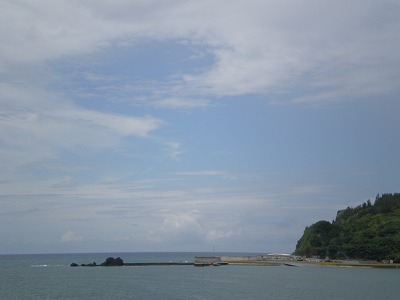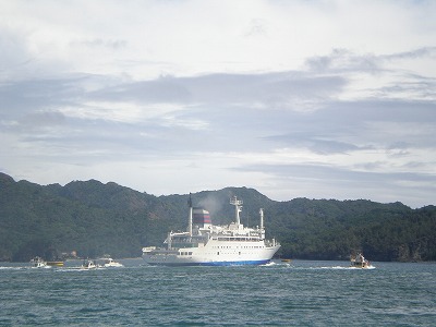 先ほど乗ってきたおが丸が14時に出港していきました。青灯台から見送ります。加山雄三の“海よー俺の海よー♪”という曲が流れる中、たくさんのボートに並走され、小さくなっていきました。