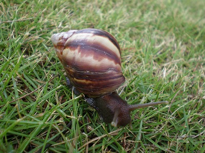 再び町を歩き、時間もあるので、水産センターへ。途中、スコールにあいながらも無事到着です。水槽にはウミガメ。センター内にも小さな魚が少しだけいます。また、帰り道にマイマイを見つけ思わず写真を撮りましたが、実はどこにでもいるらしい。。雨上がりに民宿の庭でも見かけました。。