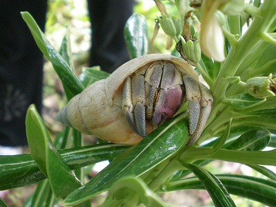 宿につき、お昼を食べに町へとお出かけ。その後、ビジターセンターに行き父島について少し学びました。ふと見ると、タコの木。そしてオカヤドカリ。どちらも小笠原で初めて見るものたちです。