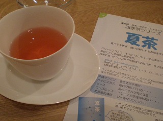 ブレンドティーを作る前に、まずいただいたのは四季に合わせて発売されるという夏茶。 夏バテを防ぎ、強い日差しから肌を守るお茶とのこと。ブレンドされているのは、沖縄サンニン、ハイビスカス、ヒース、ローズヒップ、北海道和薄荷の5種類。口に含むとほんのりとした甘さがあり、最後に薄荷の香りがするクセがなくて飲みやすいお茶です。