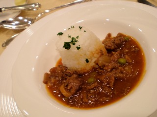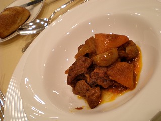 さて、試食。スパークリングワインで乾杯した後、まずは、オージー・ラムロインのタタキ。お肉の下には茗荷。さっぱりとしてお肉と合います。オージー・ラムショルダーと初夏の野菜のタジン風煮込みは、香辛料がきいていてちょっとクセがある感じ。和風な味付けのタタキに変わって今度はエスニック料理です。