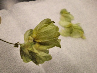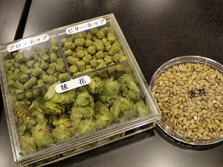 テーブルの上には、ビールの原料である麦芽、毬花、アロマホップ、ビターホップが置いてあり、それぞれ手に取って見ることができました。毬花は軸を中心に割いてみると、中には黄色い粉。。緑色の花の部分ではなく、この粉の部分だけをビール作りに使うそうです。ツンとした苦そうな香りがします。