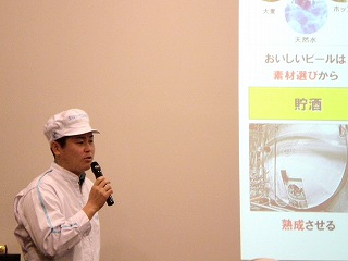さて、イベント開始。まずは「ザ・プレミアム・モルツ講座」から。武蔵野ビール工場の醸造技師の林さんから、プレミアムモルツのこだわりなどについてお話を聞きます。
