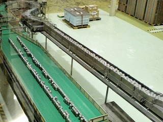 トンネルを抜けると、貯蔵タンクやろ過装置、缶・箱詰めの見学デッキがあります。この日のベルトコンベアにはビールではなく、酎ハイ缶が次々と流れていました。