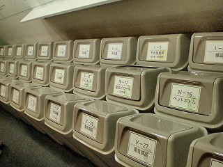 工程見学の最後には工場のエコの取組みが紹介されています。ゴミゼロ工場を実施しているとのこと。で、驚いたのがゴミの分別。ゴミを36種にも分別していて、ゴミ箱が36個並んでいます。。