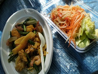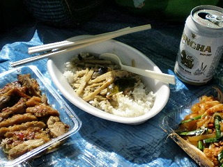 食べる場所を探していると、食事を終えた方からブルーシート付きで場所を譲ってくれるという声かけが。。で、ようやくランチです。タイの音楽が遠くに聞こえるなか、料理を並べてシンハー
