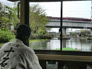 舟はアクリル窓で仕切られているので、寒さはさほど感じずに済みます。柳の枝や緑の木々を見ながら、緩やかな川の流れをのんびりと進みます。途中の橋では電車が通過。。過去と現在の融合です。。
